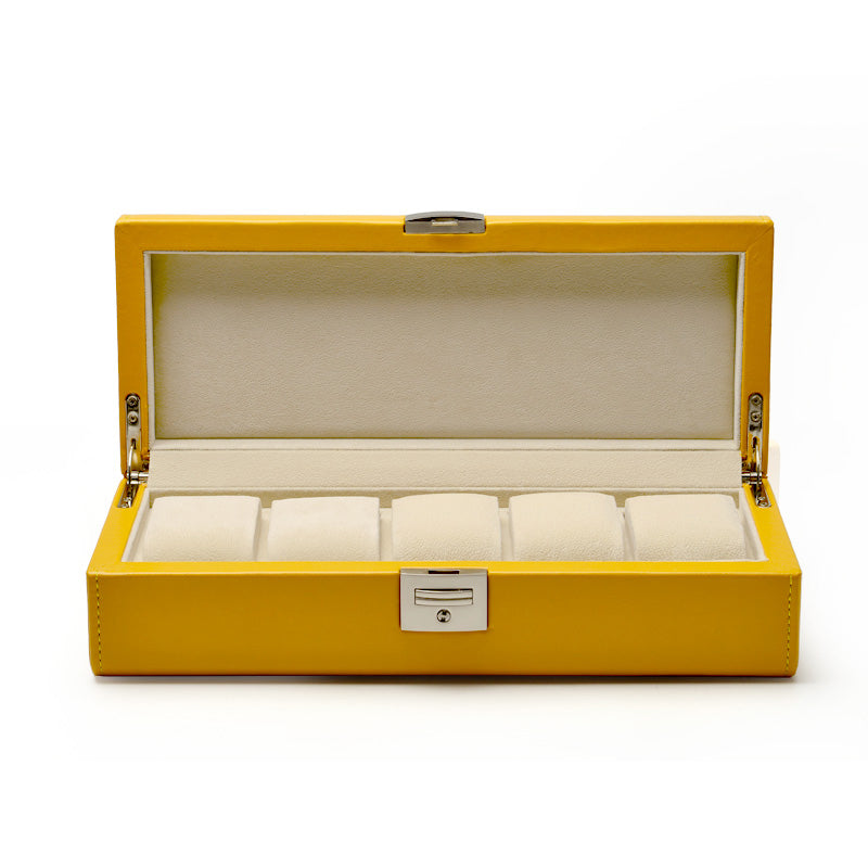 Rangez et organisez facilement vos précieuses tocantes grâce à ce coffret à montres femme. Conçu avec une base en MDF, matériau reconnu pour sa solidité, le coffret est recouvert d’une couche en simili cuir de couleur jaune, lui donnant ainsi un look moderne et unique. La surface intérieure est tapissée de velours, offrant à vos montres un espace doux et confortable pour se reposer lorsque vous ne les portez pas. Un fermoir en métal argenté vient compléter cet ensemble.